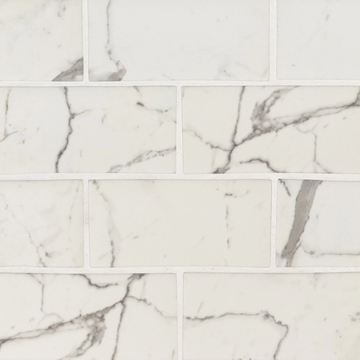 MSI’s Statuario Celano 3 in. X 6 in. recycled glass Subway tile features a soft white background with gorgeous gray veining.